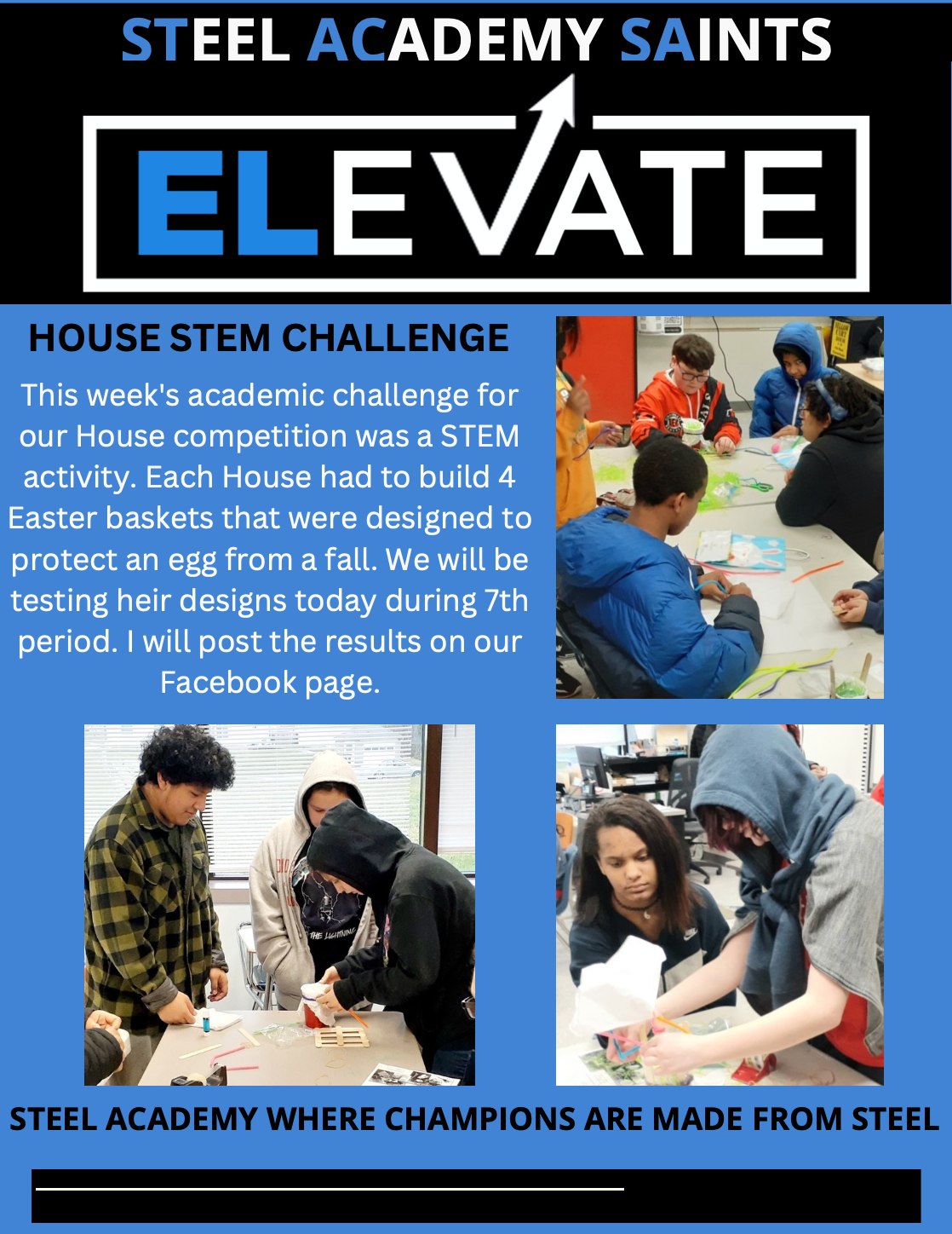 One of the greatest indicators of a healthy school is parent/guardian involvement. We would like to invite all of our parents/guardians to join our reboot of the GUARDIANS OF STEEL PTO. Find out more in this week's newsletter on how you can become involved. Also, this week's academic challenge for our House competition was a STEM activity involving Easter eggs. Ever try a Twix cheesecake? Our Steel Grill students created a delicious dessert you have to see! Be sure to download this week's newsletter to find out more about these stories and remember we're on Spring Break next week!