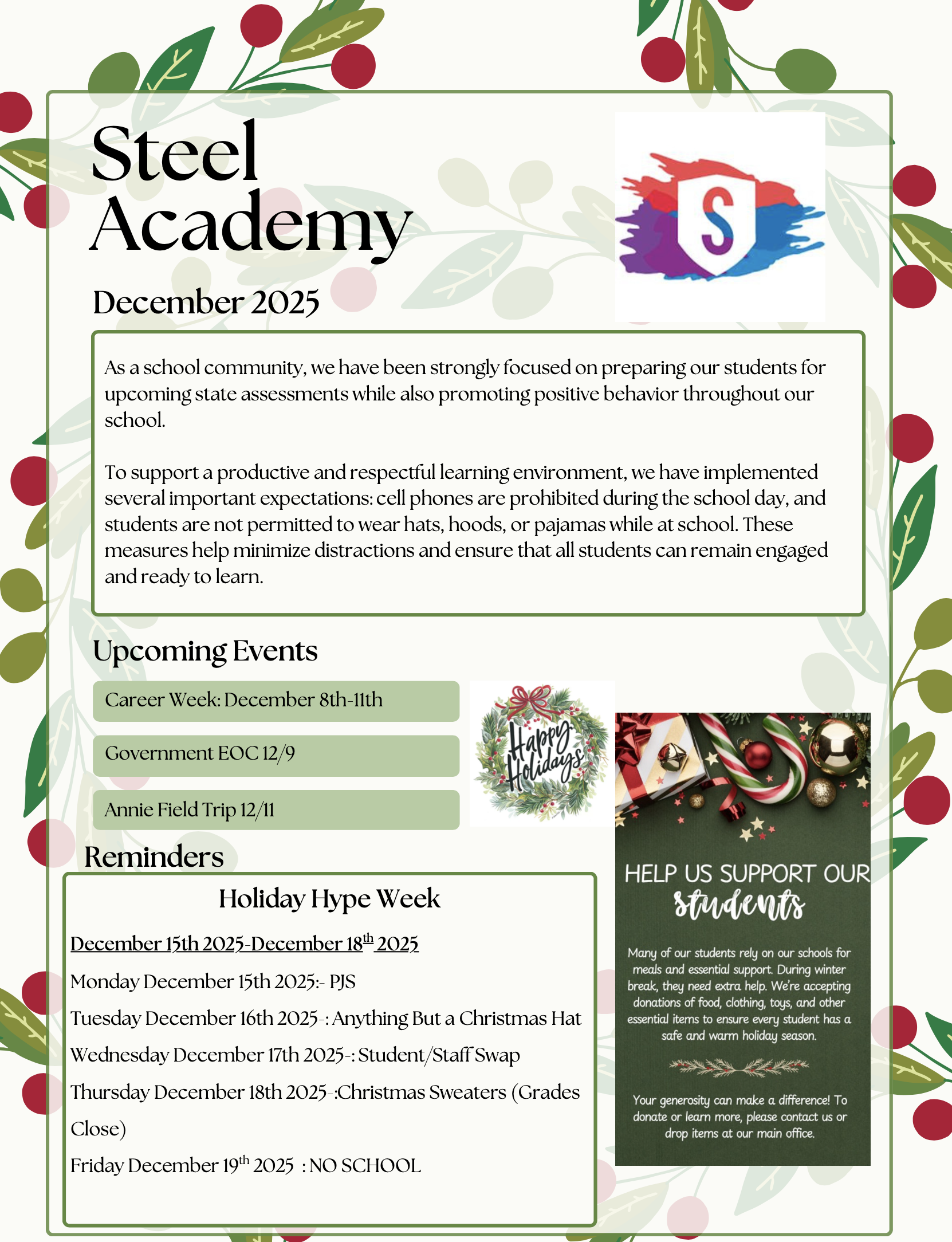 It’s the holiday season and we have some special ways we are going to celebrate the season. With our seasonal plans in place we still need our scholars to stay focused on their studies. As a school community, we have been strongly focused on preparing our students for upcoming state assessments while also promoting positive behavior throughout our school. We are implementing some new rules to help minimize distractions and ensure that all students can remain engaged and ready to learn.