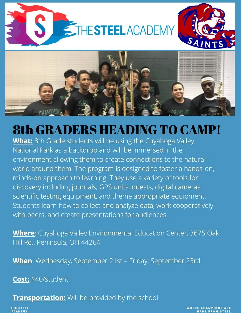 Our 8th grade students will be heading on a field trip and using the Cuyahoga Valley National Park as a backdrop. They will be immersed in the environment allowing them to create connections to the natural world around them. The program is designed to foster a hands-on, minds-on approach to learning. They use a variety of tools for discovery including journals, GPS units, quests, digital cameras, scientific testing equipment, and theme appropriate equipment. Please download this week's newsletter to find out more about this field trip and other events taking place.